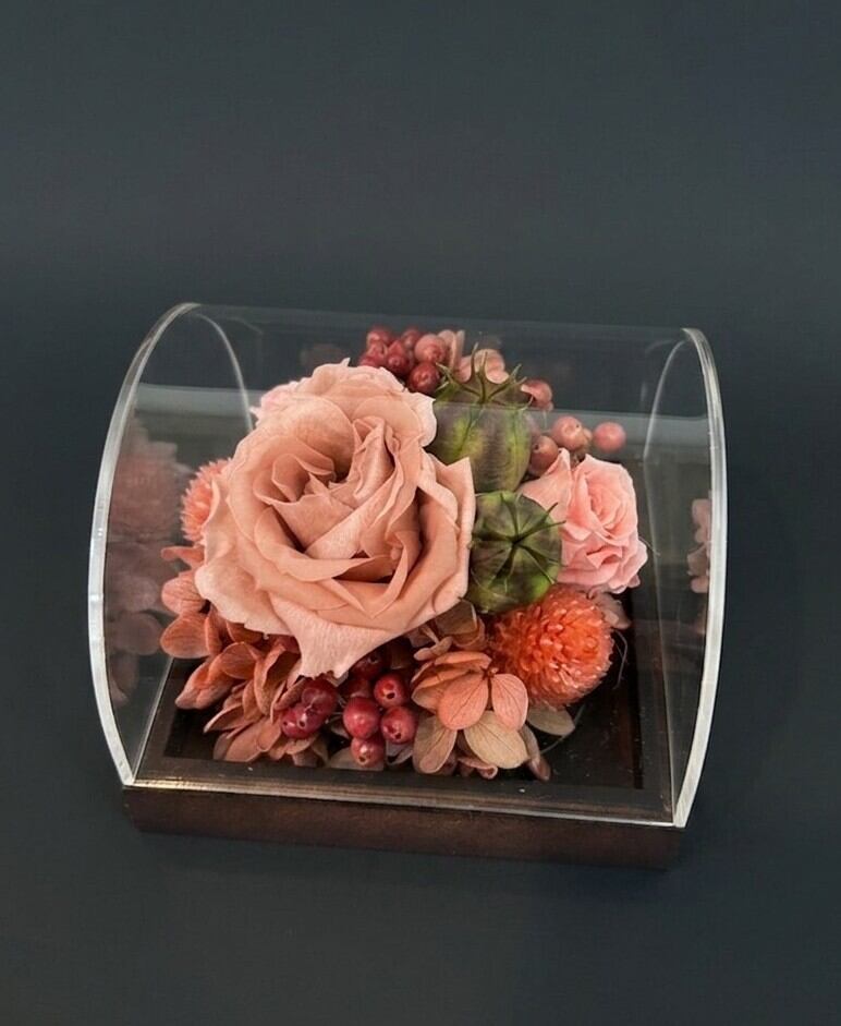 プリザーブドフラワーのアレンジメントがアクリルケースの中に入っています。