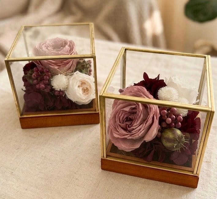 プリザーブドフラワーのアレンジメントがガラスケースの中に入っています。